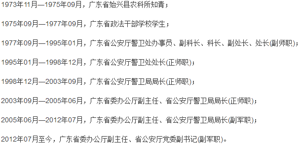 1977年9月后的十余年间,他历任广东省公安厅警卫处办事员、副科长、科长、副处长、处长,此后担任广东省公安厅警卫局局长,其军职亦一路升至正师职。