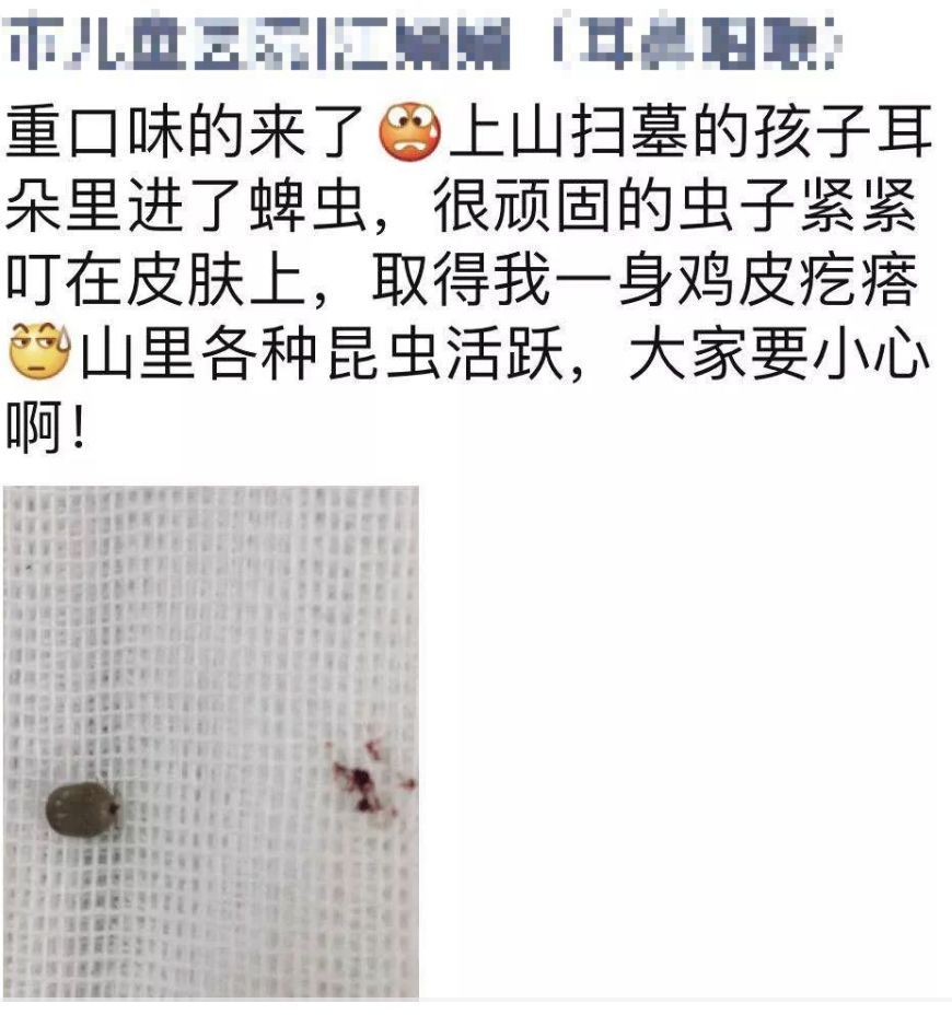 “上山扫墓的孩子耳朵里进了蜱虫,很顽固的虫子紧紧叮在皮肤上,取得我一身鸡皮疙瘩。山里各种昆虫活跃,大家要小心啊!”