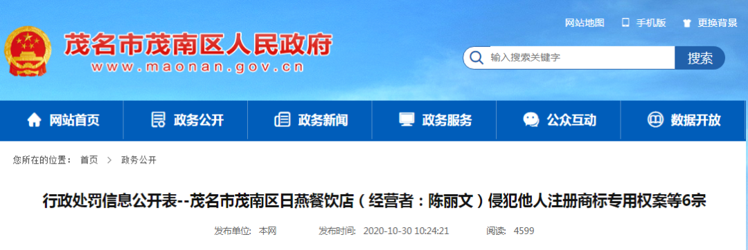 茂名市茂南区日燕餐饮店(经营者:陈丽文)因侵犯他人注册商标专用权,作以下处罚: