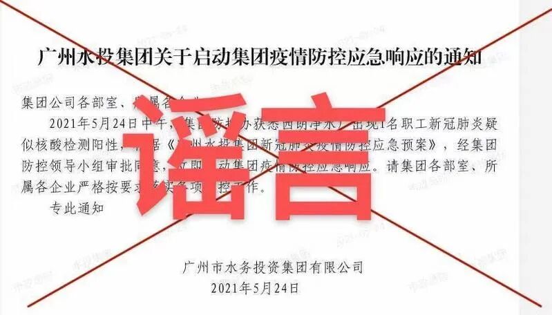 广州水投集团发布重要说明称,2021年5月24日下午,网传广州水投集团1名职工核酸检测结果疑似阳性。经核查,此消息不实。请广大市民朋友不信谣、不传谣。