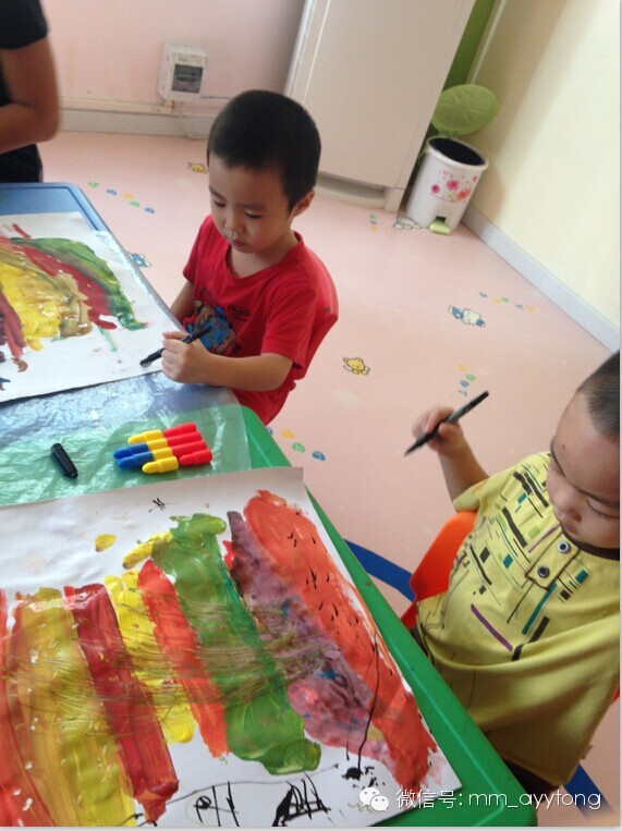 体会三:爱育绘画把我们不熟悉的东西,直接呈献给孩子,效果非常好。爱育绘画教学法打破了以前一些概念式绘画,使我们一下子找到使儿童画画得到提高,同时培养了观察力和创造力这样一个途径。孩子更放得开些。原来的美术教学更传统些,比如画一个西瓜,或其它静物,都是教师示范得多,或是出一张示范画,教孩子怎样画,限制了孩子的思维。爱育的方法先让孩子学会观察,孩子可以用各种符号表达他们认识的事物,比较尊重孩子的个性,孩子会有更大的想象天地。应该说是很经典的一套教学。以前很盲目,有时候设置一个课程,感觉到不系统,现在用这套体系,教学明显系统,让孩子学得一个环节,接着一个环节。孩子明显感觉到学得有兴趣,有滋味,学习就象玩一样,增加了学习的兴趣。