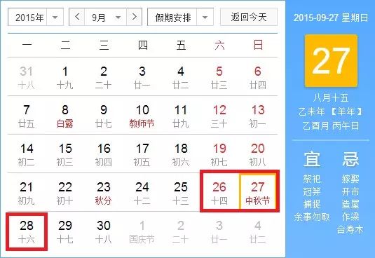 6、2015年中秋节:9月27日放假,9月28日(星期一)补休 共三天。