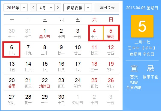 3、2015年清明节:4月5日放假,4月6日(星期一)补休,共三天。