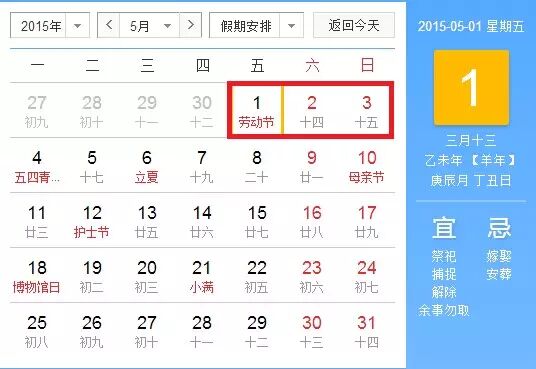 4、2015年劳动节:5月1日至3日放假,共3天。5.1是周五 所以不调休。