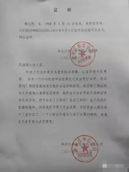 【公安发文吐槽民政局:补办老年证也要打证明,有必要吗?】一位老太老年证丢失需补办,湖南冷水江市同兴派出所为其开具一份《丢失证明》,同时附有该所给民政局的一封信:“中央三令五申要让老百姓少走弯路,补办一小小老年证也要打证明,有必要吗?”该所民警称,确有该文,旨在好意提醒。